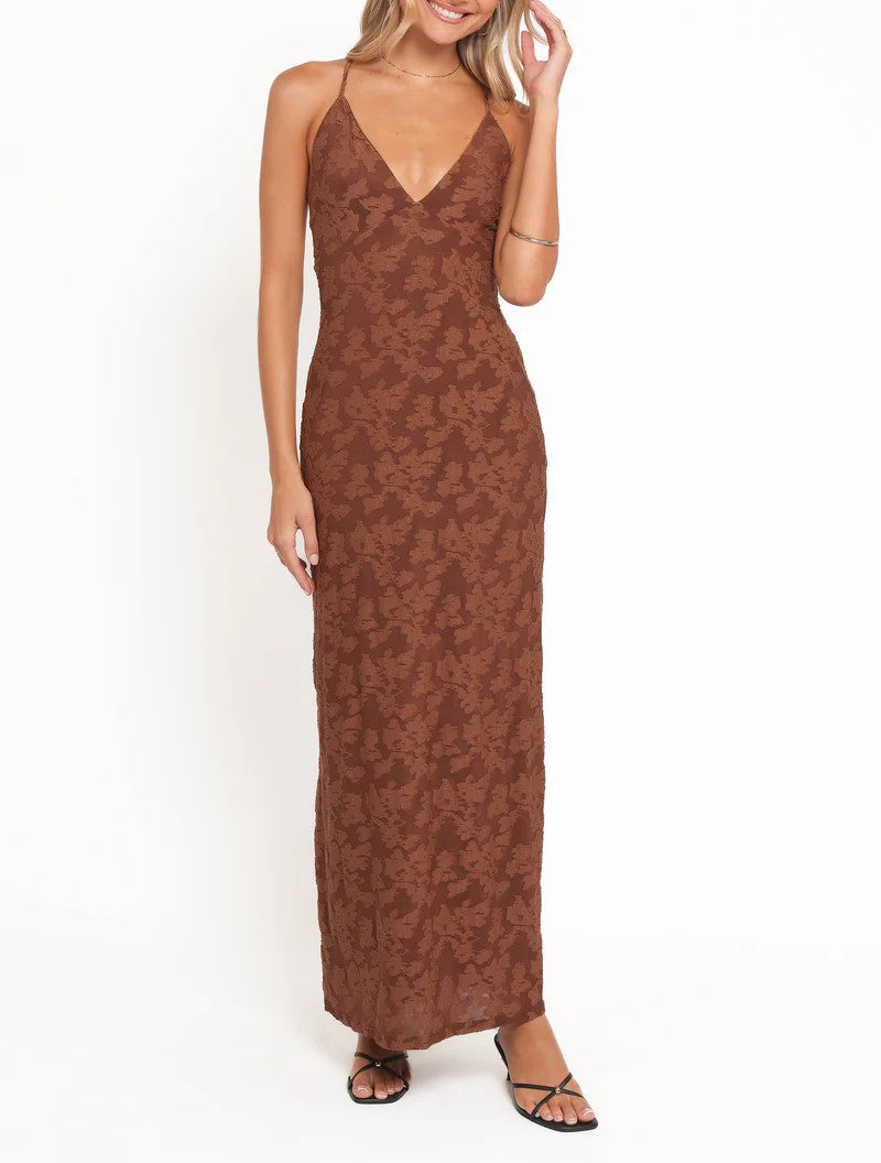 Turn heads in the Maxi Dress. This stunning brown dress features a flattering halterneck with...